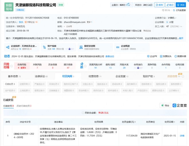 2月7日消息,企查查顯示,近日,天津貓眼現場科技有限公司因在營業性演出活動中,不履行應盡義務的行為,違反了《營業性演出管理條例實施細則》第二十三條第(七)項規定,依據《營業性演出管理條例實施細則》第四十九條、《營業性演出管理條例》第四十五條的規定,被清遠市清城區文化廣電旅遊體育局沒收違法所得1.4萬餘元,罰款11.7萬餘元,累計罰沒13.1萬餘元。
