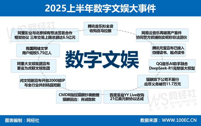 上半年,數字文娛領域動作頻頻。騰訊音樂擬全資收購喜馬拉雅,我國網絡文學用户規模5.75億人,網易雲音樂再破黑產案件。對此,網經社數字文娛台對2025上半年數字文娛大事件進行盤點回顧。