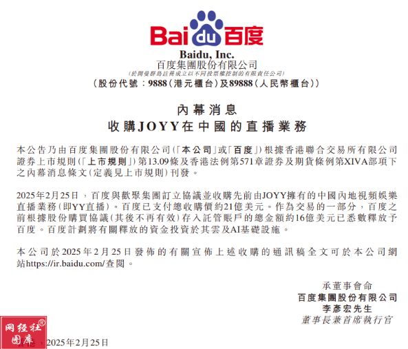 2月26日消息,百度與歡聚集團(JOYY)共同宣佈了一項備受矚目的新協議。根據公告內容,百度將以約21億美元的價格重新收購歡聚集團旗下的國內視頻娛樂直播業務YY Live(即YY直播)。這一新協議的達成標誌着雙方在經歷了長達數年的波折後,終於完成了這場複雜的交易。