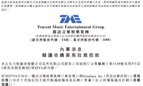 6月10日下午消息,騰訊音樂娛樂集團(以下簡稱“騰訊音樂”)發佈公告稱,騰訊音樂與中國領先的在線音頻平台之一喜馬拉雅控股(以下簡稱“喜馬拉雅”)及其他若干訂約方就擬收購喜馬拉雅簽訂併購協議及計劃。交易交割後,喜馬拉雅將成為騰訊音樂的全資附屬公司,進一步鞏固其在音頻內容領域的戰略佈局。