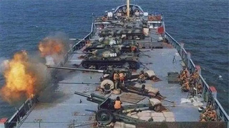 1996年台海危機期間,解放軍進行兩棲登陸演習,由於艦艇與裝備不足,當時曾徵用不少民船來運送部隊與裝備,同時為了進行火力支援,還把陸軍的裝甲車、自行火炮等拉上民用貨船甲板當艦炮使用。(圖源:互聯網)