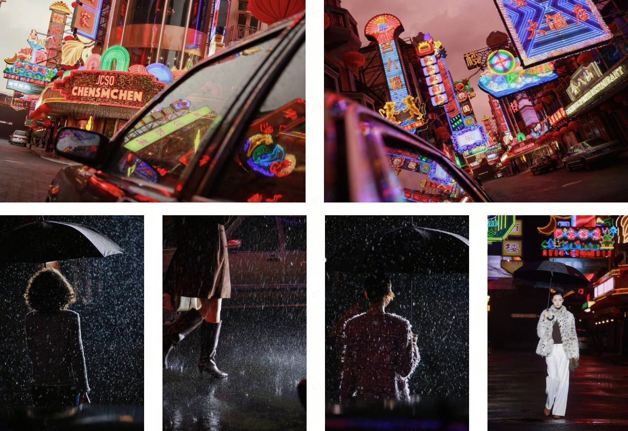 大秀選址斥資5億還原的90年代黃河路實景,這是該場景首次對服飾大秀開放。3萬餘根手吹玻璃霓虹燈點亮雨夜,構築出極富電影感的舞台。超過100款新品沿街而秀: