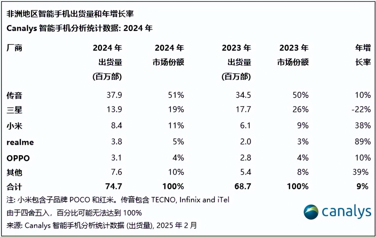 2024年全年,小米在非洲的市場份額達到11%,與第二名的三星(19%)差距正在縮小。realme在2024年也實現了89%的驚人年增長率。