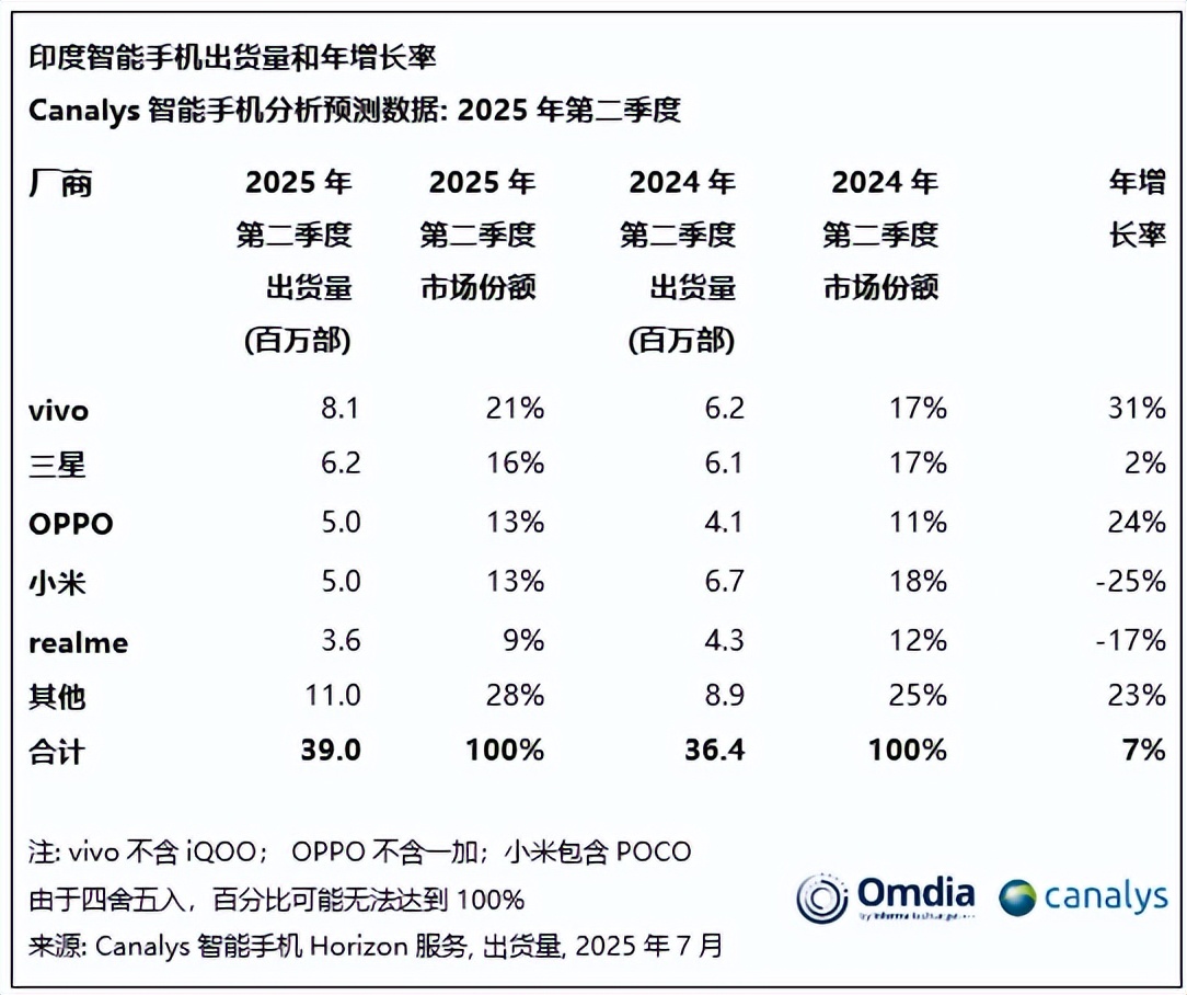 儘管傳音目前在印度智能手機市場的表現,尚未進入主流視野,根據市場調查機構 Canalys 的數據顯示,2025年第2季度,印度智能手機出貨量為3900萬台,同比增長7%,vivo以810萬部出貨量和21%的市場份額,位居市場首位,隨後是三星、OPPO、小米、realme,傳音尚在“其他”類別之中。