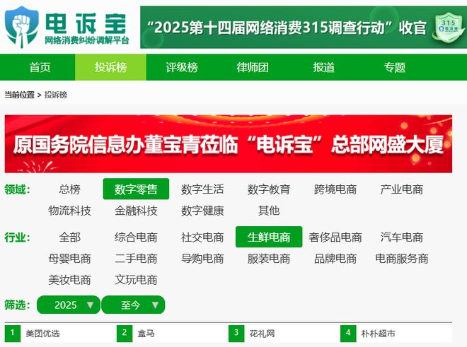 2025年至今,“電訴寶”受理投訴中涉及的數字零售領域生鮮電商用户有效投訴顯示(依據投訴量排行),被投訴的主要平台有:美團優選、盒馬、花禮網、樸樸超市等。