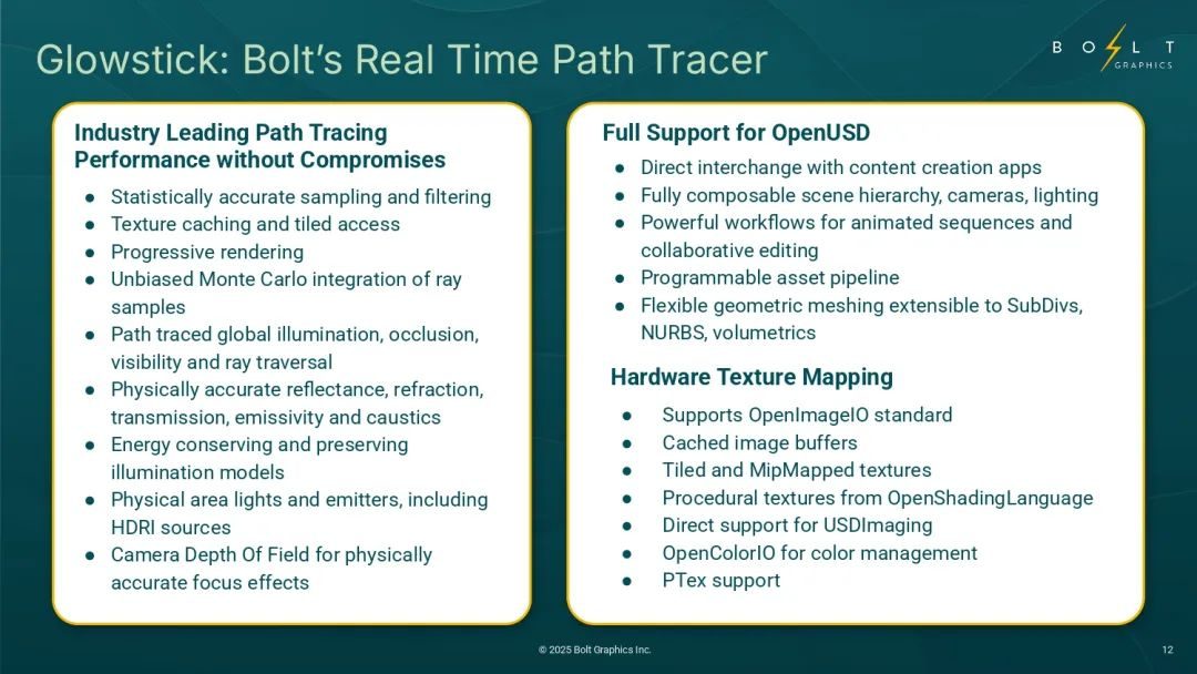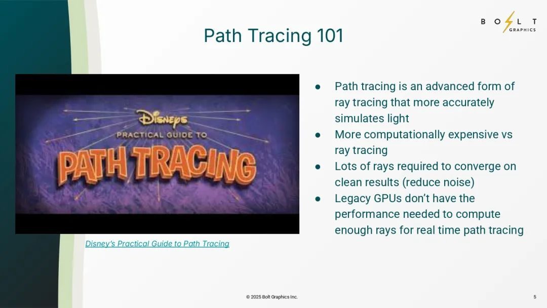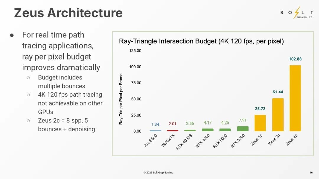 其提供的數據源顯示:RTX 5090 在 4K 120 FPS 狀態下每像素支持8條光線;Bolt 的 1c卡支持“25 條以上”,2c版可上到“100 條”。這意味着它們在單位時間內處理路徑追蹤的密度,比英偉達現實用途 GPU 強上 4–12 倍。