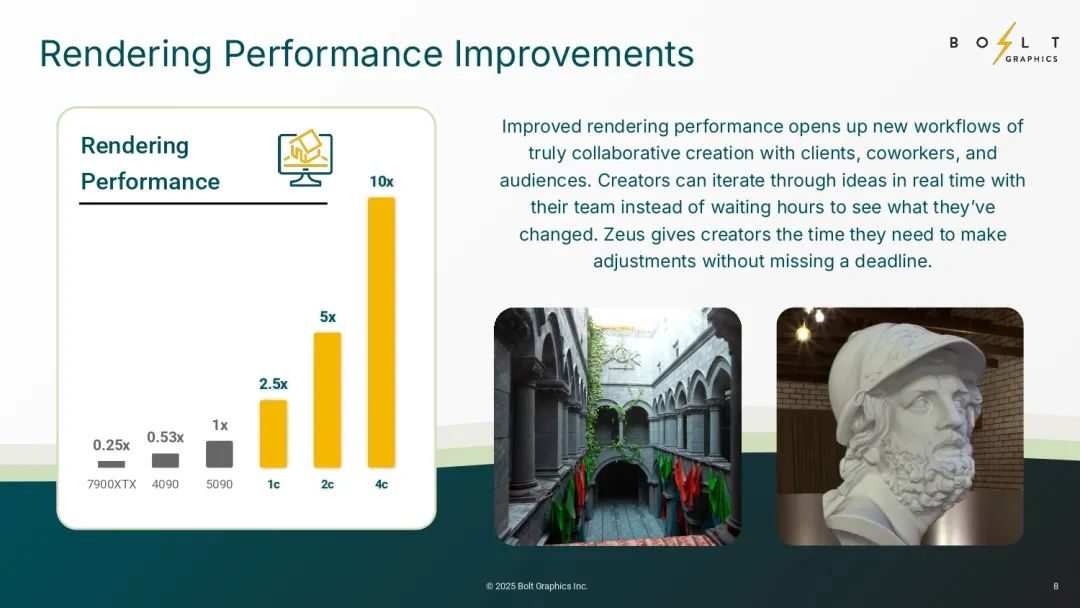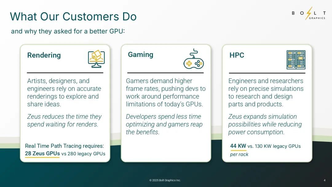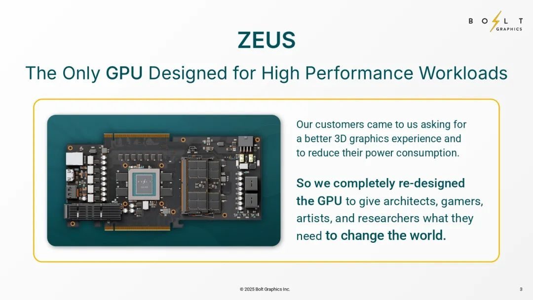然而,就是在這樣一片巨頭橫行的紅海中,出現了一家初創公司:Bolt Graphics。他們的目標不是花裏胡哨地跟風,而是用一塊叫做 Zeus 的新型GPU,直指路徑追蹤的終極可能。有人説這是“挑戰英偉達最強顯卡的”嘗試,那筆者想説,這不僅僅是挑戰,更像是“另闢蹊徑”,從不同的維度重新定義“GPU”的未來。