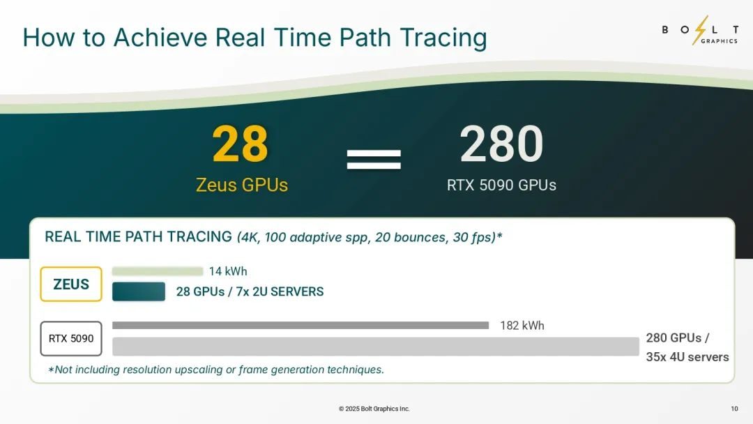 Bolt 宣稱,一套典型 4K 路徑追蹤場景(20 次反射、30 FPS)下,英偉達 RTX 5090 需要 280 張卡,而Zeus僅需28 張卡就能完成。這意味着效能提升了整整 10 倍。功耗方面,更是以驚人的 1/10 全面碾壓傳統 GPU。