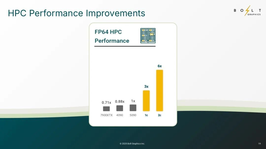 除了圖形渲染外,Zeus 在 HPC 領域也宣稱提供顯著加速。FP64 是 HPC 的核心,而英偉達主攻 AI 上的 FP16、FP32,因此在 64-bit 運算上不佔優勢。Bolt 發佈的資料稱: