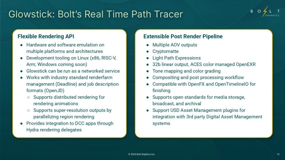 當然,一塊卡若沒有配套的軟件,就只是石頭。Bolt投入大量資源開發專屬路徑追蹤引擎 Glow Stick,承諾與主流渲染工具高度兼容:包括 Blender、Maya、3DS Max、Houdini、Nuke 等。其支持高精度採樣和物理蒙特卡洛積分,Ptex、OpenShadingLanguage、多級 MipMaps;全路徑追蹤所有光學特效、包括焦散、散射等,API 提供 Shader/Pipeline 定製,開發者可深度控制等應用功能。