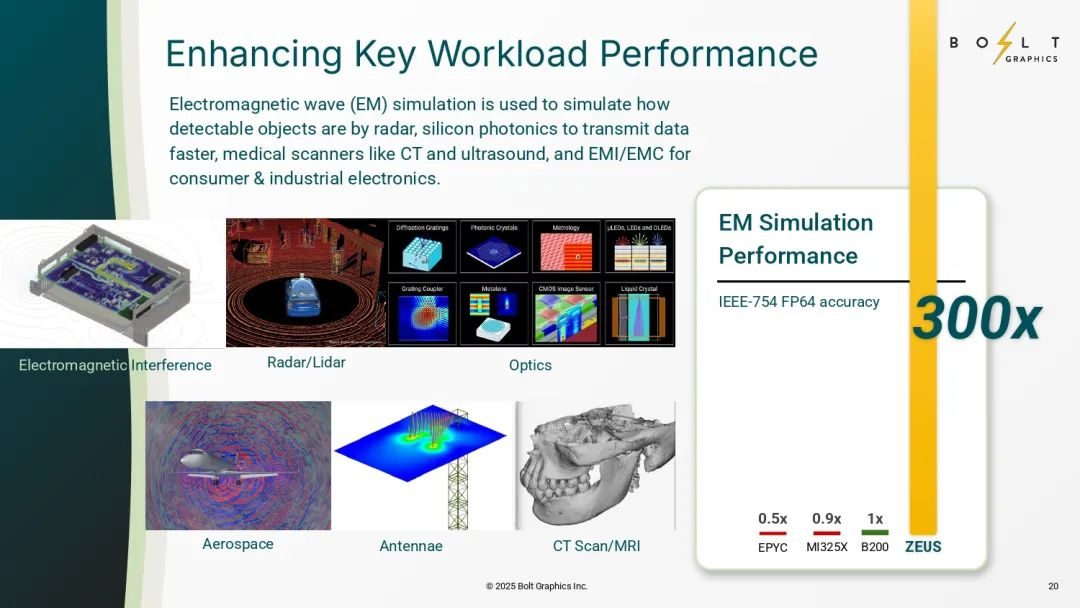 FP64 計算上:單芯版約 3 倍於 5090,雙芯版約 6 倍;在電磁波模擬(如 CT、MRI、EM 兼容性掃描)中,他們聲稱性能高達 Blackwell GPU 的 300 倍;APC 數據還提及,4c卡的模擬空間是 Blackwell B200 的 40 倍(38 億模擬單元 vs. 9110萬);值得一提的是,Zeus還支持 IEEE-754 FP64 標準並執行數值一致性——這對 HPC、科研人士而言,意味着結果可復現、可信賴。