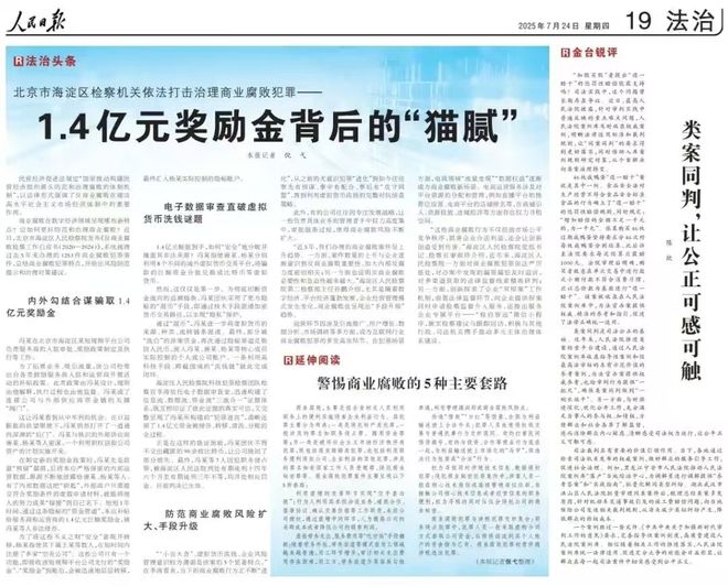 7月24日,人民日報19版刊發頭條文章《北京市海淀區檢察機關依法打擊治理商業腐敗犯罪——1.4億元獎勵金背後的“貓膩”》,披露北京市海淀區人民法院審結了一起職務侵佔案。
