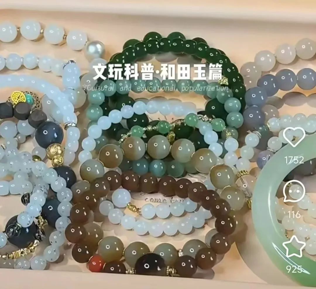 手串愛好者一朵向「定焦One」分享,她從2022年入坑手串,當時備考的她偶然在小紅書看到水晶科普帖子,於是在直播間購入了一串“助學業”的紫水晶,後來一發不可收拾,從水晶圈拓展到了文玩圈;Ariel則更為直接,作為一名活躍用户,她經常刷到文玩的帖子,直到自己買了第一串碧玉:“突然血脈覺醒,垂直入坑文玩”,開啓分享之路。