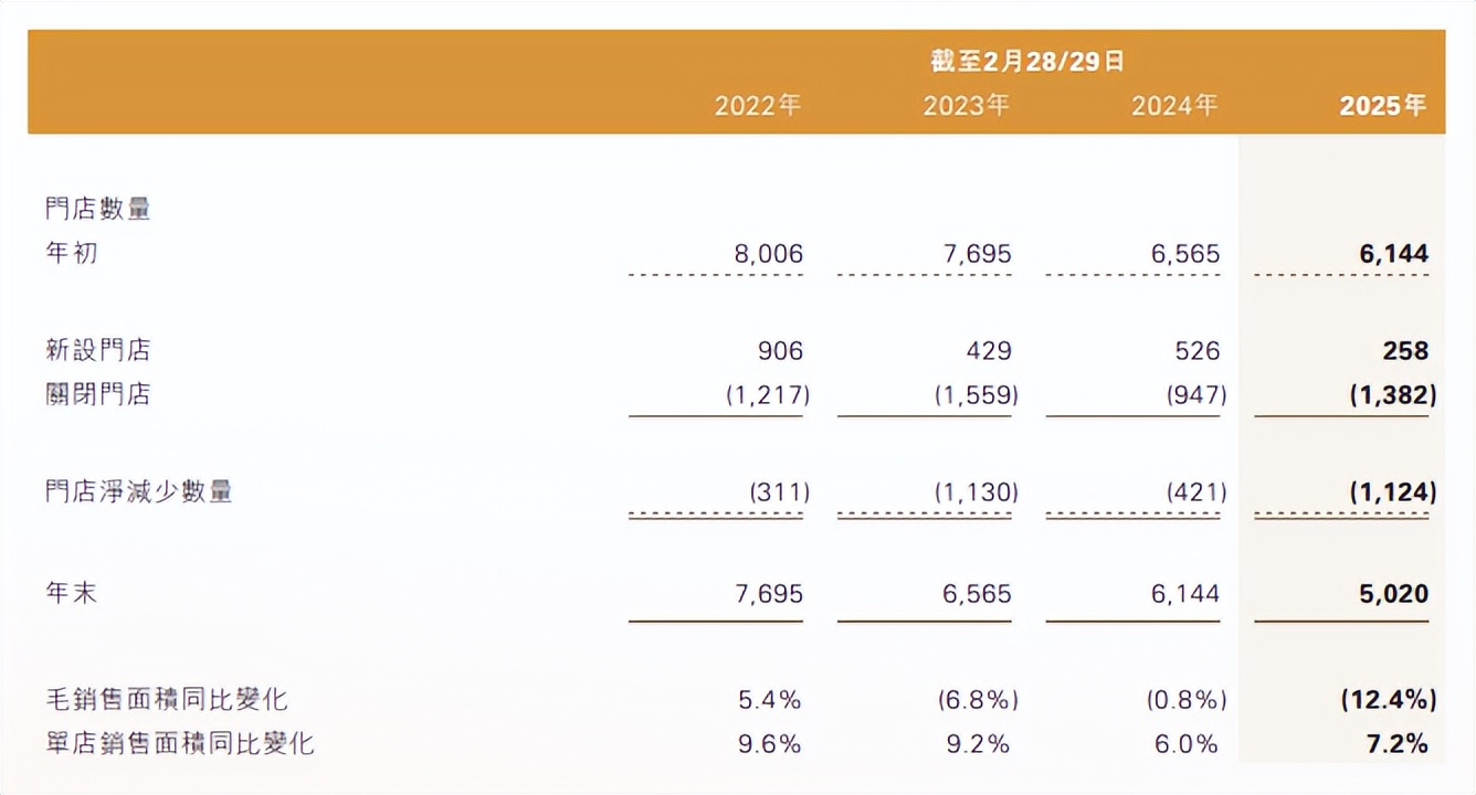 根據財報,2022-2025財年內,滔博門店數量從最高的8006家鋭減近3000家至5020家,幾乎消失了一個寶勝;門店毛銷售面積同比下降幅度擴大至兩位數;單店銷售面積同比波動下滑。