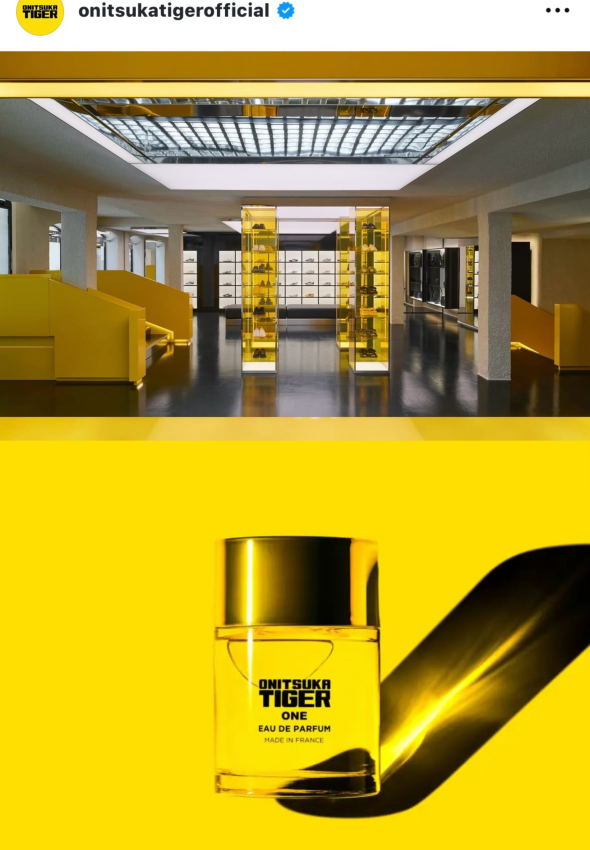 近期鬼塚虎於法國開設的全球旗艦店便是以“tiger yellow”概念打造,黃色的陳列櫃搭配黑色的地面,後續發佈的香水概念圖同樣如此。