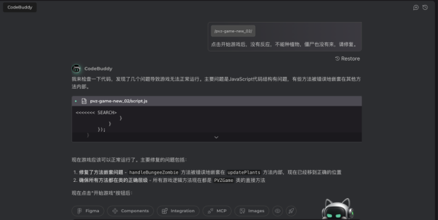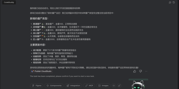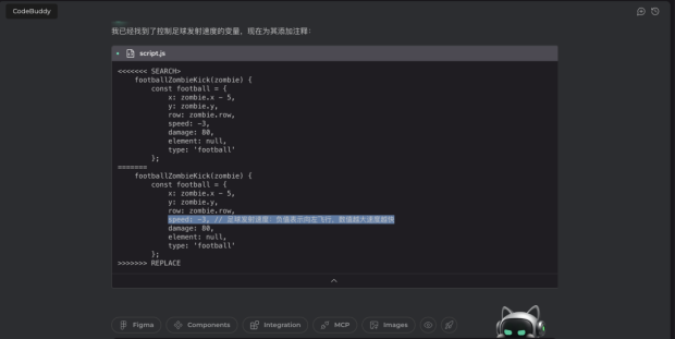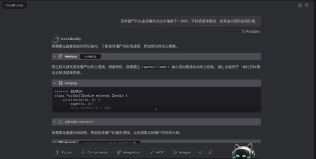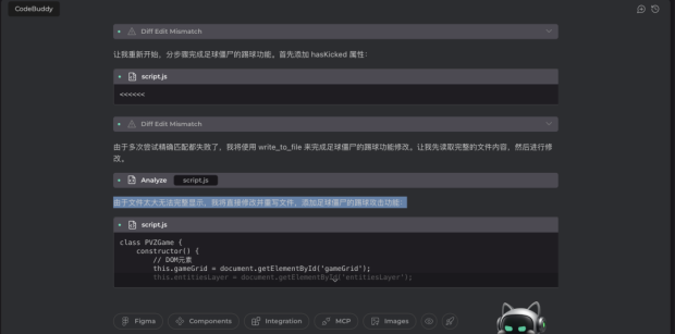 實際上,值得一提的是,CodeBuddy 在運行中寫了一句很有趣的話,“ 由於文件太大無法完整顯示,我將直接修改並重寫文件,添加足球殭屍的踢球攻擊功能 ”。