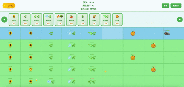 玩家選中植物後,點擊可用格子即可種植;種植後該格子進入“已佔用”狀態,不能重複放置。