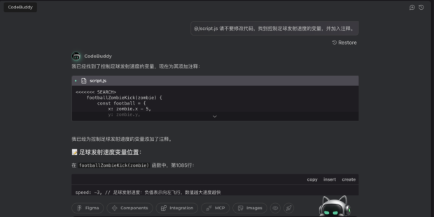 因此,為了降低足球發射的速度,知危讓 CodeBuddy 不要修改代碼,只需要幫忙找到對應的邏輯即可。