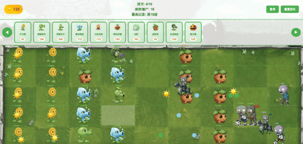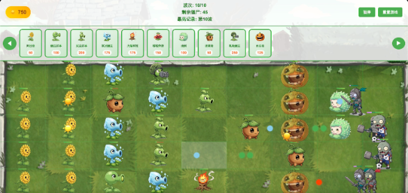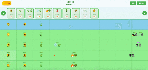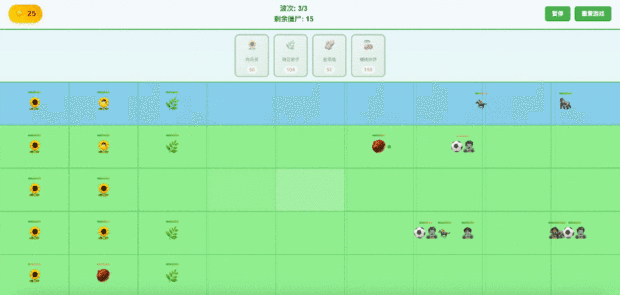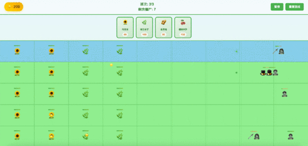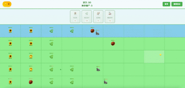 修復了點擊 “ 開始遊戲 ” 沒有反應的 Bug 之後,遊戲就能正常運行了。植物有四種,是原版早期會有的向日葵、豌豆射手、堅果牆、櫻桃炸彈,殭屍有三種,普通殭屍、鐵帽殭屍和劍士殭屍,一共有三波,打完就結束。