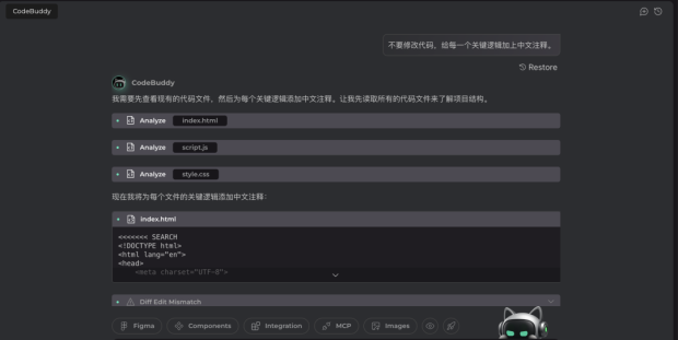 CodeBuddy 團隊也提醒知危,一千多行的 JavaScript 文件對於 CodeBuddy 或 Claude 4 Sonnet 已經是負擔很大了,後續可以考慮把 JavaScript 文件進行合理拆分。