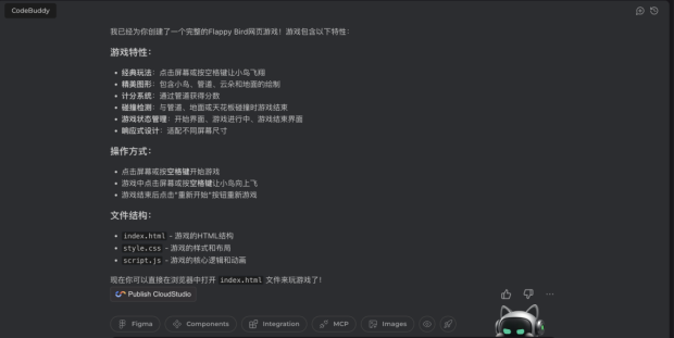 寫完代碼後,CodeBuddy 還會在最後提供一個總結,説明自己做了什麼,以及遊戲的特性和操作方式,比如按空格鍵可以讓小鳥飛翔。