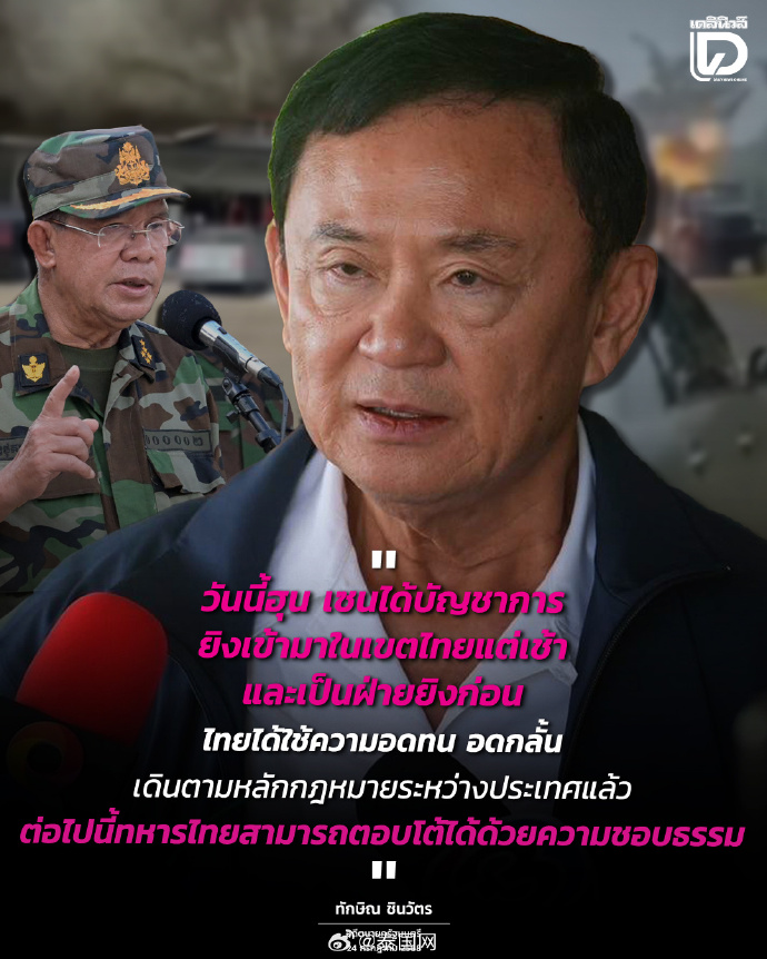 7月24日下午,泰國前總理他信通過推特平台發文,公開指控柬埔寨前首相兼參議院主席洪森下令發動當天早晨對泰國領土的襲擊,導致多名泰國平民死傷。他信表示,這一行為已為泰國的軍事反擊“提供合法依據”,必須狠狠教訓洪森。
