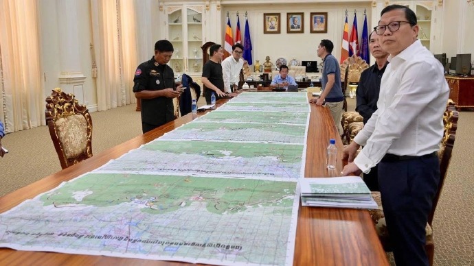在洪森發佈的照片中,他正與團隊圍站在工作台旁,桌上攤開一張清晰可見的大型作戰地圖。幾分鐘後,包含地圖細節的照片被刪除,僅保留展示指揮室整體氛圍的照片。