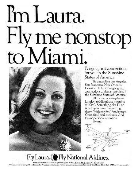到後來,整個國家都參與其中,色情化空姐。美國國家航空公司推出充滿性暗示的“Fly me”廣告活動,這個系列的每則廣告都會出現一位空姐面帶笑容的特寫照片,並配合“我是xxx,和我一起飛吧”的文案。