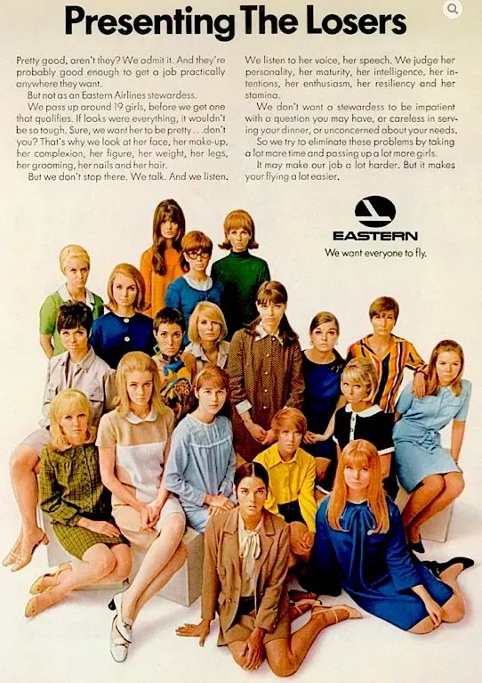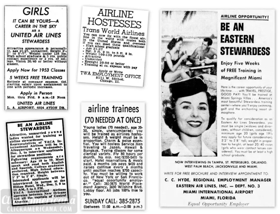 1966年,《紐約時報》刊登了一則美國東方航空公司招聘空姐的廣告,列出了以下要求:高中畢業,單身(喪偶或離婚且無子女的也可考慮),20歲。