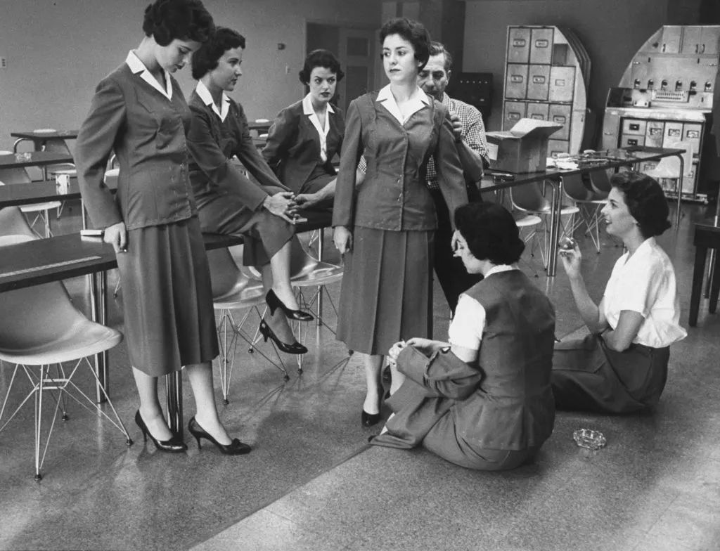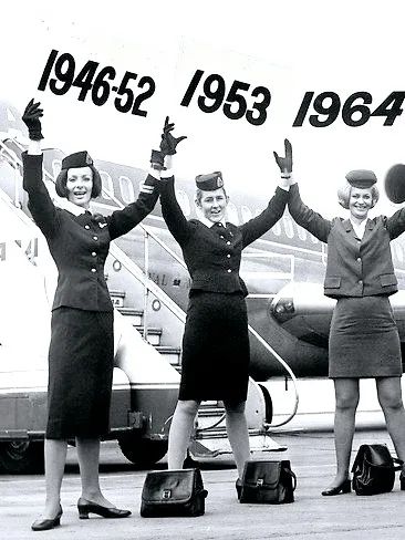 當時,她們的統一制服以實用為主,是一套雙排扣的羊毛套裝和羊毛披肩,以確保在當時透風的機艙工作時足夠保暖。披肩上還得有足夠大的口袋,用來裝下固定座椅的工具。