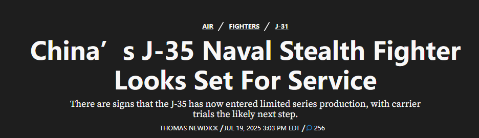對於艦載版殲-35隱形戰鬥機,美國“動力”網站“戰區”頻道分析稱,最近照片上出現了近距離拍攝的兩架殲-35空中編隊。它們的飛機制造編號(0011 和 0012)“強烈表明”它們處於低速率初始生產階段。