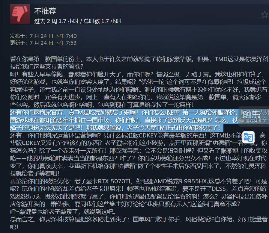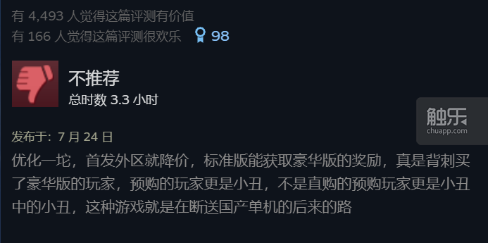 在這則公告中,官方表示,“外區降價”是後台配置錯誤,導致部分地區價格顯示異常,目前正在緊急聯繫Steam進行正確價格的回調——也就是説,這是一次失誤。但並不是所有玩家都相信這個解釋。在部分玩家看來,開發組宣稱“國區維持價格不變”是對國內玩家支持的回應,那麼現在按同樣的邏輯,“其他區降價”當然可以被視為對其他國家玩家的支持,同時也是對國內玩家的背叛。