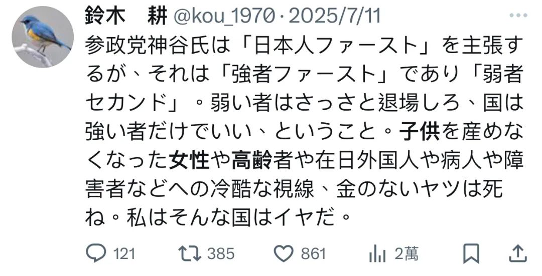 “神谷主張‘日本人優先’,不過就是‘強者第一、弱者第二’。他希望所有弱者能夠儘快離開日本,日本就應該由強者治理。對於那些無法生育的女性、老年人、在日的外國人、病人、殘障人士以及身無分文的人冷眼旁觀,像這種政客,我只希望他儘快消失,我不希望日本會變成這樣。”