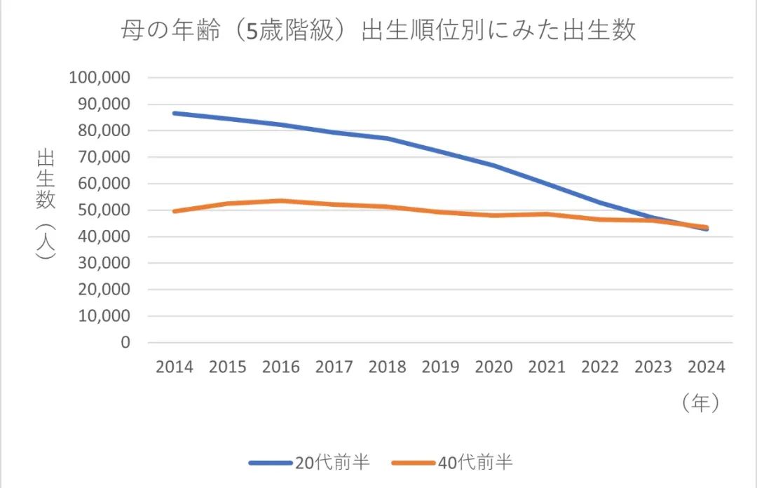 2024年,日本20代初孕產婦為4萬2754人,40代初孕產婦為4萬3463人。