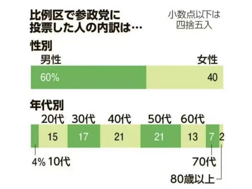 根據朝日新聞的出口調查顯示,在本次參議院選舉的比例選區中,支持參政黨的有60%為男性,40%為女性。
