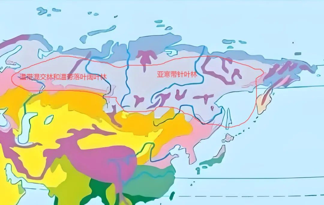 西西伯利亞南部的耕地面積有3億多畝。這就是沙鵝能佔據西伯利亞的物質基礎。圖中的粉色區域,是這塊耕地的核心地帶。當地植被為温帶混交林和温帶落葉闊葉林帶。這個植被條件下,生成的土壤就是肥沃的黑土。