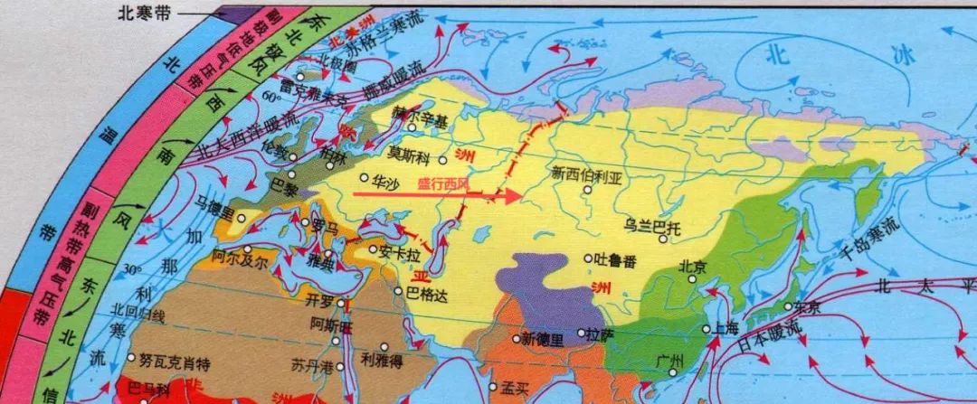其一,就是北大西洋暖流。這使得歐亞大陸西邊的歐洲相比位於東邊的西伯利亞温度要高。