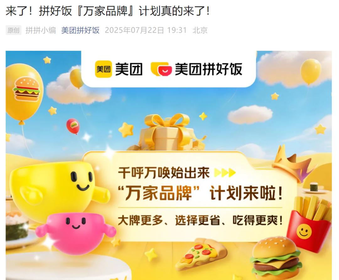 7月22日,美團官宣了拼好飯萬家品牌計劃,稱拼好飯將引入1萬家知名餐飲品牌。