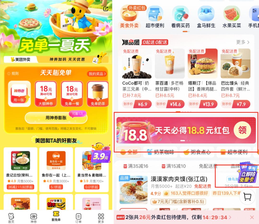 左為美團膨免單界面,右為淘寶閃購首頁界面,圖源美團APP、淘寶APP