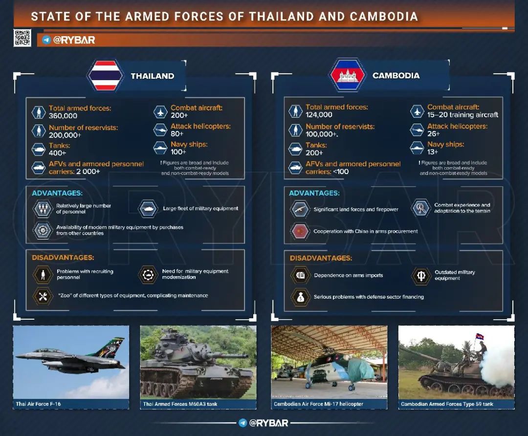 參考倫敦國際戰略研究所發佈的《2025年版軍事平衡》報告來看,在軍力對比方面,泰國明顯要強於柬埔寨。現役兵力層面,泰軍總員額高達36萬,此外還有20萬預備役與4.5萬準軍事部隊;柬埔寨總員額僅有12.4萬,另外還有4.5萬安全部隊與6.7萬準軍事部隊。當戰事發展需要投入大規模兵力後,柬埔寨將會處於下風。