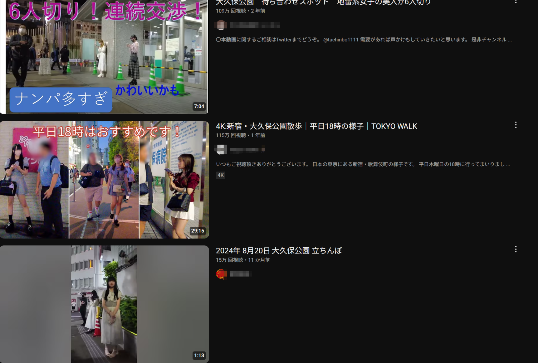 但是抓,是抓不完的。逮捕了這個,更多的站街女如同雨後春筍接連不斷地冒出來。在一些海外平台上,搜索日語站街女(立ちんぼ)或者大久保公園的羅馬字——「tachinbo」、「OKUBO PARK」等,可以看到大量相關視頻映入眼簾。