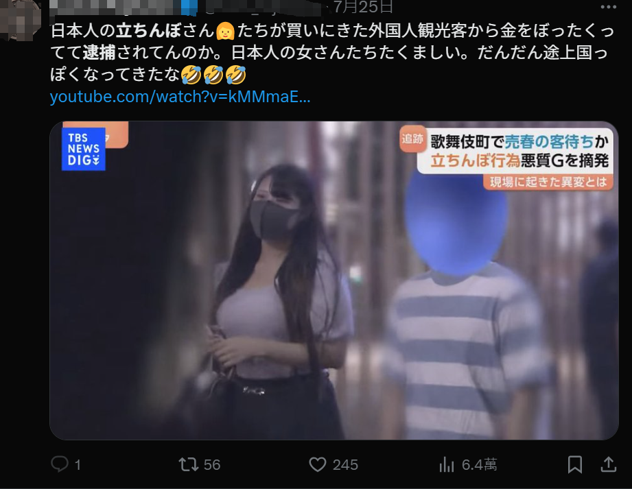 疫情過後,訪日遊客數量急劇增加。站街女又找到了新目標,專坑外國遊客,使得案件性質更加敏感。