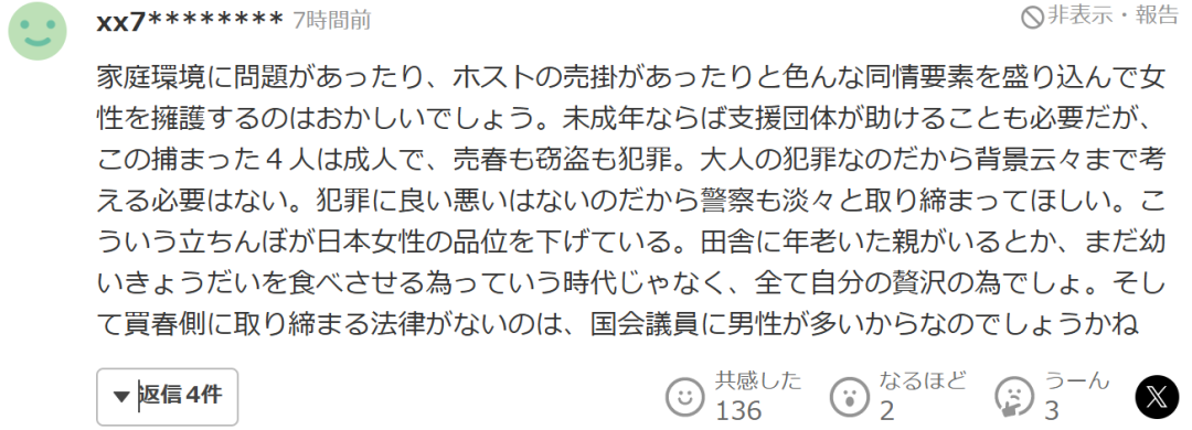 “有家庭環境問題、揹負着牛郎欠款等各種同情因素來為女性辯護,這是不對的。如果是未成年人,支援團體提供幫助是必要的,但這次被捕的4人都是成年人,賣春和盜竊都是犯罪。既然是成年人犯罪,就沒必要去考慮他們的背景之類的理由。犯罪沒有好壞之分,警方應該淡然依法嚴肅取締。這種站街行為正在降低日本女性的品格。現在不是為了鄉下年邁的父母,也不是為了養活年幼的兄弟姐妹的時代了,全部都是為了自己的奢侈消費。而且針對買春方沒有相應的法律處罰,是因為國會議員中男性居多嗎?”