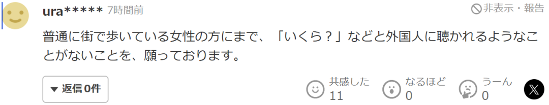 “真心希望普通在街上走的日本女性們,不會被外國人問到「多少錢?」這樣尷尬又不尊重的問題。”