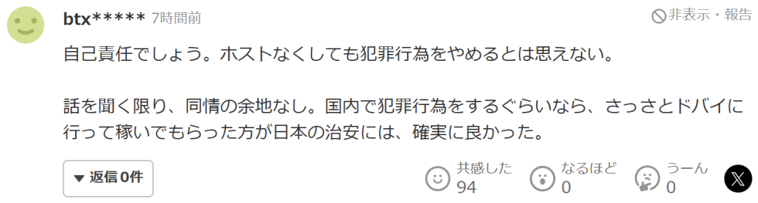 從聽到的情況來看,毫無同情的餘地。與其在國內進行犯罪活動,不如趕緊去迪拜賺錢,這對日本的治安無疑會更好。”