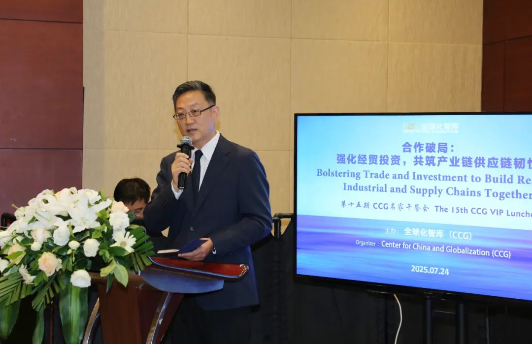 2025年7月24日,全球化智庫(CCG)在北京千禧大酒店成功舉辦第15期“名家對話午餐會”。本次活動聚焦“合作破局:強化經貿投資,共築產業鏈供應鏈韌性”的主題,旨在系統梳理經貿風險根源、探討協作路徑、凝聚行動共識,為全球產業鏈供應鏈從“被動應對”轉向“主動塑造”提供方向指引。活動由CCG理事長、國務院原參事王輝耀主持,特邀中國貿促會研究院院長趙萍,中國國際展覽中心集團有限公司董事長林舜傑,對外經貿大學法學院教授、中國世貿組織研究院研究員紀文華,《外交政策》雜誌主編拉維·阿格拉瓦爾(Ravi Agrawal)進行專題討論。