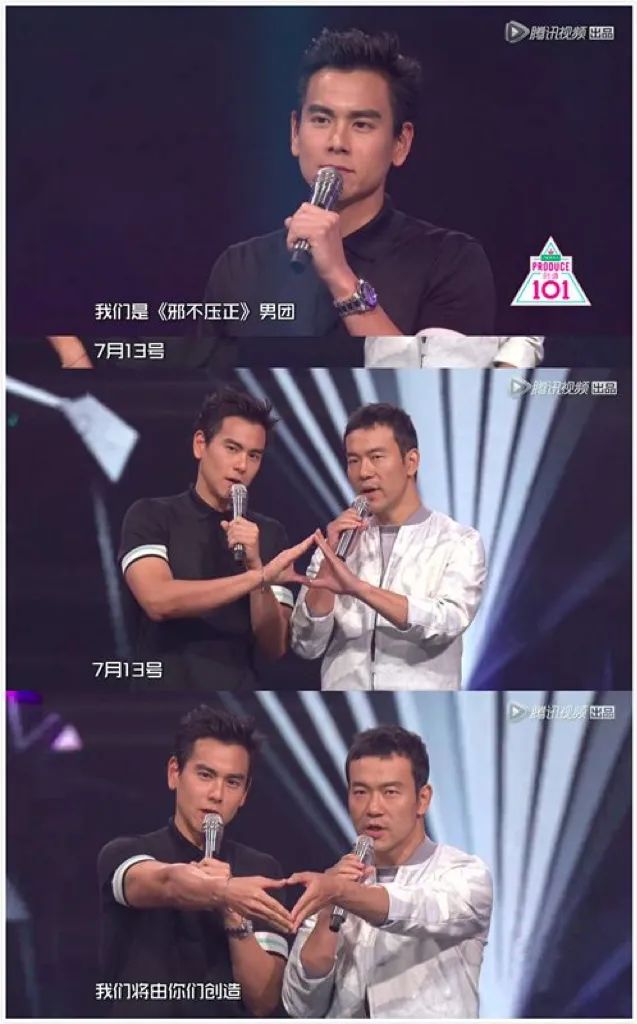 2018年6月23日,《創造101》決賽現場上,姜文帶着《邪不壓正》劇組出現在舞台上,兩位男主彭于晏和廖凡,為了宣發拼了,他們“入鄉隨俗”比愛心。