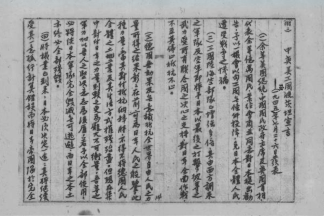 1945年7月26日,中國、美國、英國在德國柏林近郊波茨坦發表《中美英三國促令日本投降之波茨坦公告》(簡稱《波茨坦公告》),敦促日本投降,並確定了日本的侵略罪行和戰後對日本的處理原則。