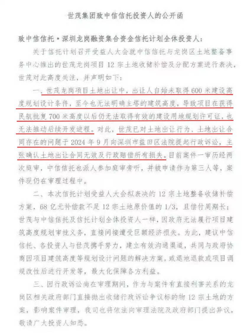 針對這次政府收儲,世茂發了一份公開函。函中公開了兩項重要信息,一個是項目拿到了民航700米高度批覆,但至今還沒取得建設用地規劃許可;另一條是,在中信信託宣佈以物抵債後,世茂便以土地轉讓合同無效為由,向法院起訴,直指政府違約在先才導致項目爛尾,提出包括土地款、利息和行政賠償在內共362億元的補償要求。在世茂看來,是政府違約在先才導致了項目遲遲無法動工。這起案件已經兩次開庭,目前仍在審理中。