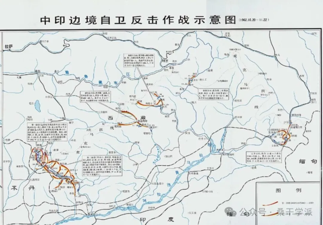 從中印邊境自衞反擊作戰示意圖可知,1962年中印邊境東段藏南戰場,達旺方向、瓦弄方向,這兩翼都打得不錯,基本逼近了中印傳統習慣線。